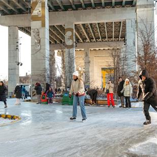 位于 Gardiner Expressway 高架桥下方的 The Bentway 冬季滑冰项目目前已全面开放。该滑冰场采用环形路线设计,适合不同水平的滑冰者,也是市中心少见的冬季户外休闲空间之一。