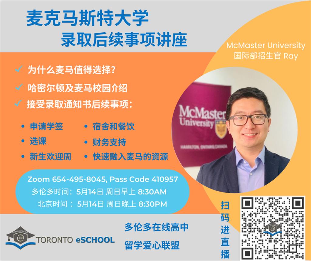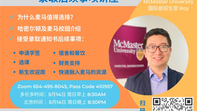 麦克马斯特大学招生官讲座-录取后续事项 5月14日周日早上8点半