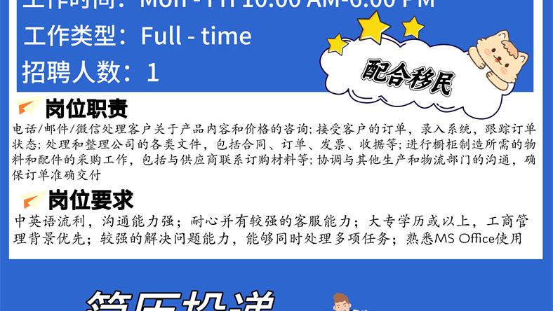 【168新岗】士嘉堡橱柜公司招聘Administrative assistant 1名 (可移民)
