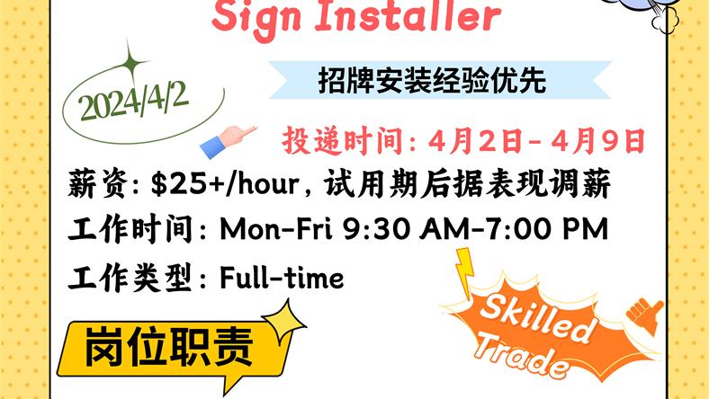【168新岗】士嘉堡招牌公司招聘Sign Installer 1名 (可移民)