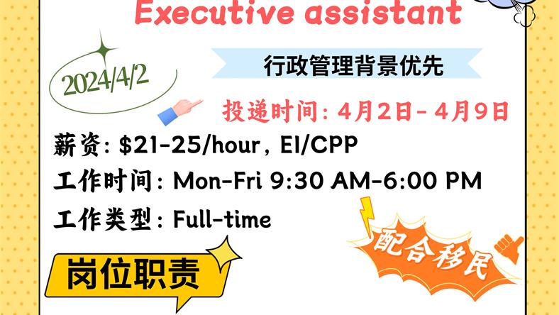 【168新岗】列治文山食品贸易公司招聘Executive assistant 1名(可移民)