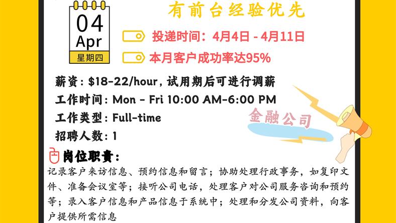 【168新岗】万锦金融公司招聘Front desk clerk 1名