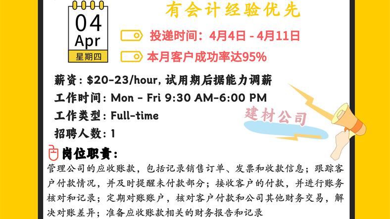 【168新岗】多伦多建材公司公司招聘Accounts Receivable Clerk 1名
