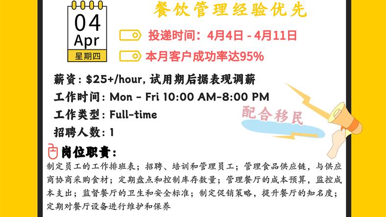 【168新岗】士嘉堡餐厅请Food Services Manager 1名 (可移民)