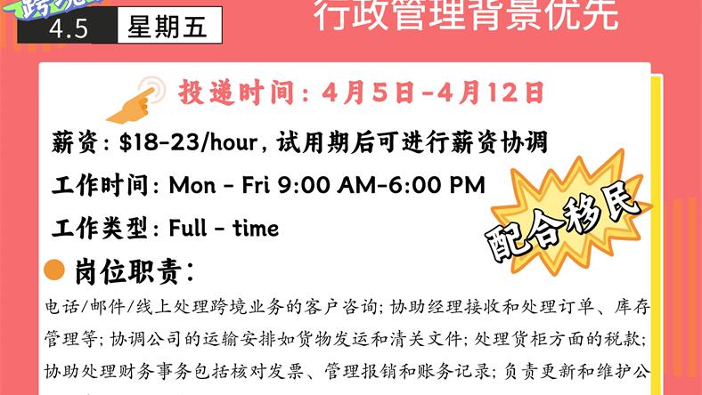 【168新岗】密西跨境物流公司招聘Office administrator 1名 (可移民)