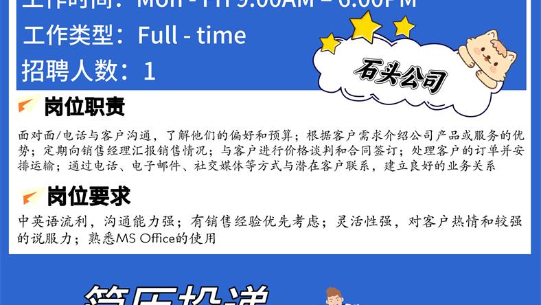 【168新岗】旺市石头公司请Sales Representative 1名