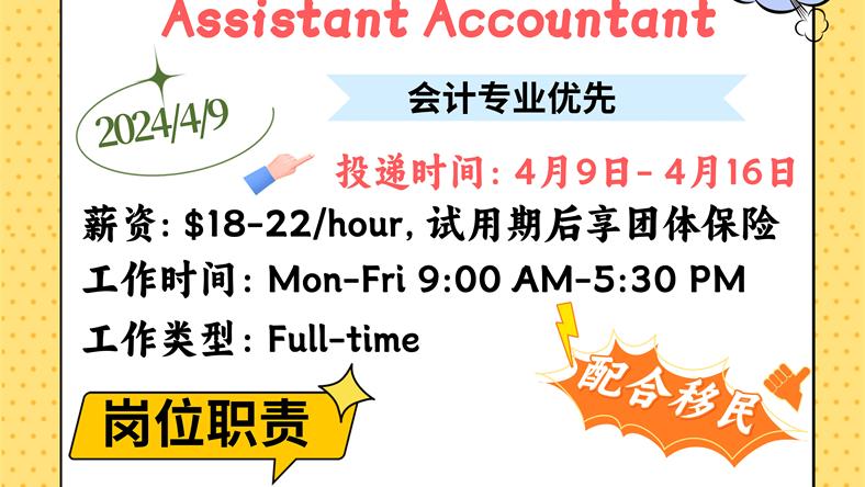 【168新岗】密西货代公司招聘Assistant Accountant 1名(可移民)