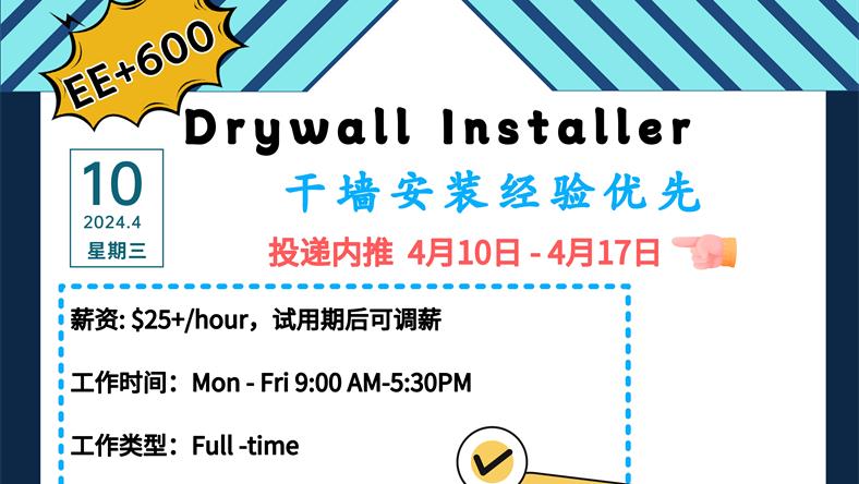 【168新岗】列治文山装修公司请Drywall Installer 1名 (可移民)