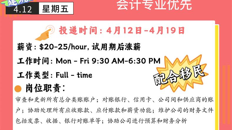 【168新岗】万锦建筑公司招聘Bookkeeping Clerk 1名(可移民)