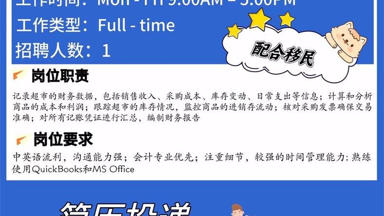 【168新岗】万锦连锁超市招聘Accountant 1名(可移民)