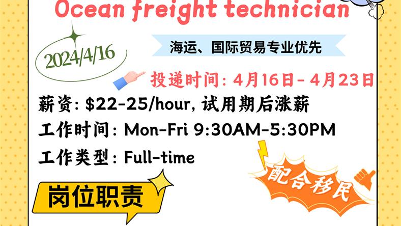 【168新岗】多伦多货运公司招聘Ocean freight technician 1名(可移民)