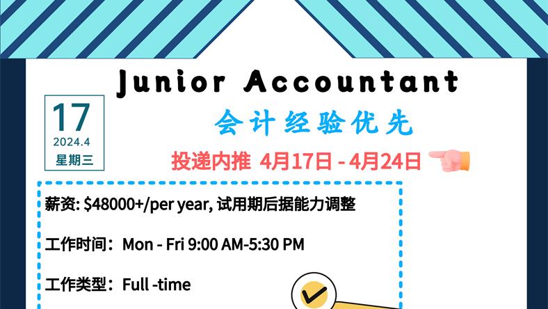 【168新岗】士嘉堡石材公司招聘Junior Accountant 1名