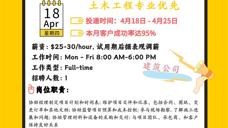【168新岗】万锦建筑公司招聘Construction Manager Assistant 1名