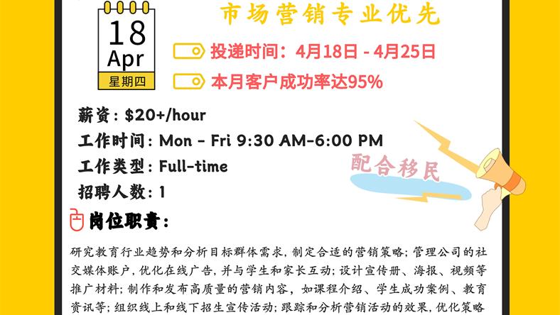 【168新岗】密西教育机构招聘Marketing Specialist 1名(可移民)