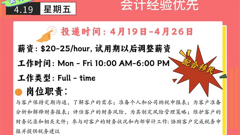 【168新岗】密西会计事务所招聘Accountant 1名(可移民)