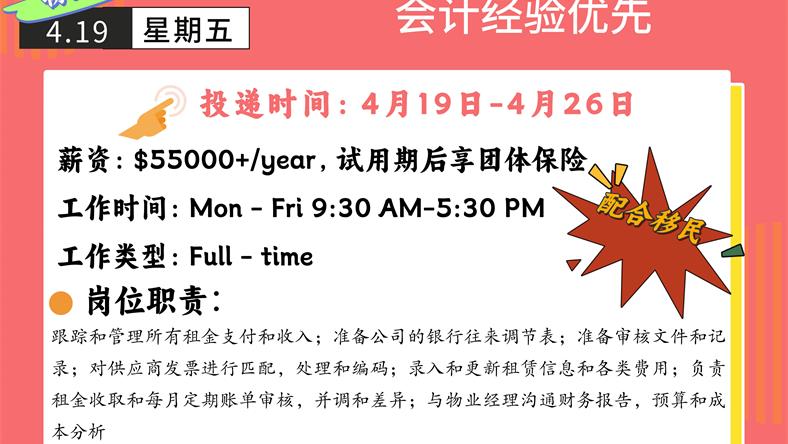 【168新岗】密西物业管理公司招聘Property Accountant 1名 (可移民)