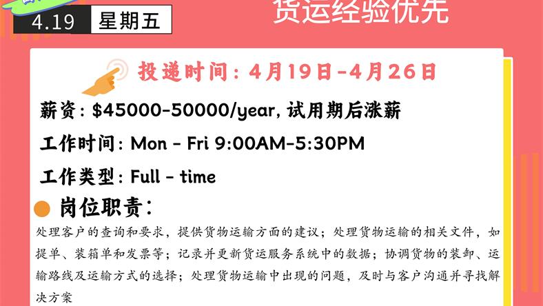 【168新岗】北约克国际货运公司招聘Freight Assistant 1名(可移民)