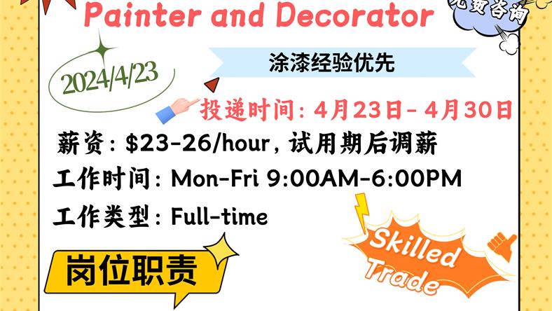 【168新岗】士嘉堡装修公司招聘Painter and Decorator 1名(skills trade +可移民)