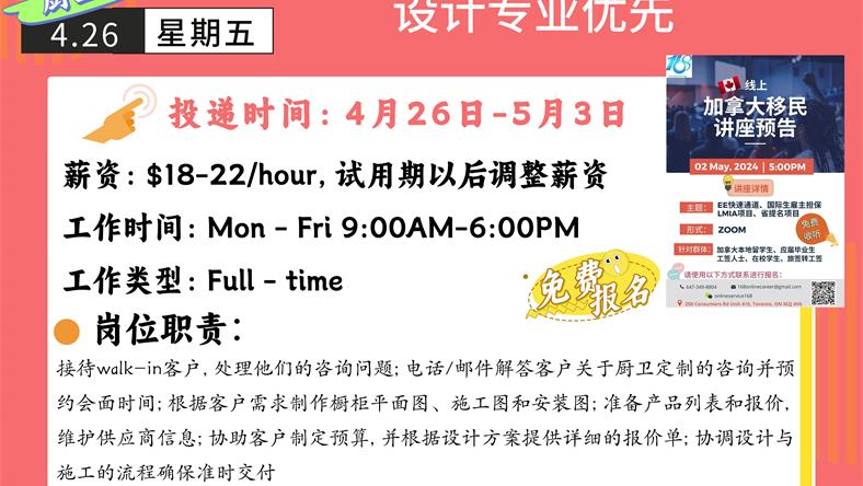 【168新岗】旺市厨卫公司请Kitchen Designer 1名(可移民)