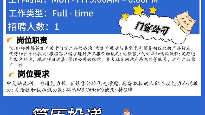 【168新岗】密西门窗公司招Sales Representative 1名