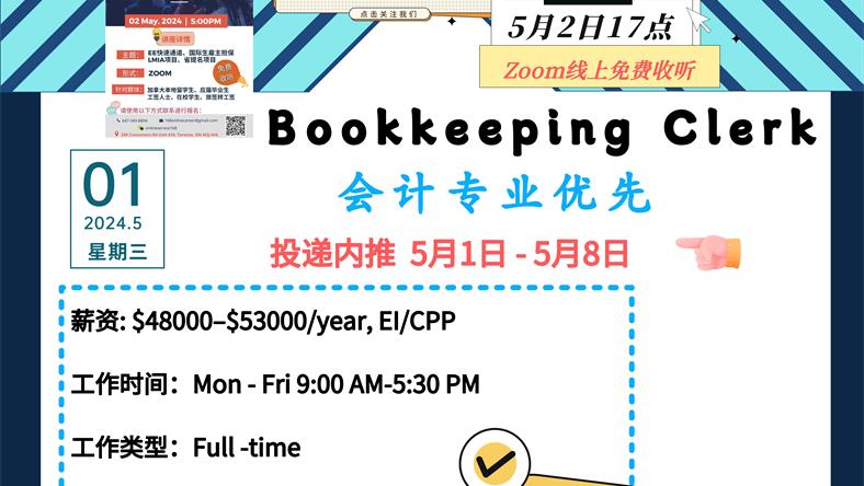 【168新岗】万锦大型建筑公司招聘Bookkeeping Clerk 1名(可移民)