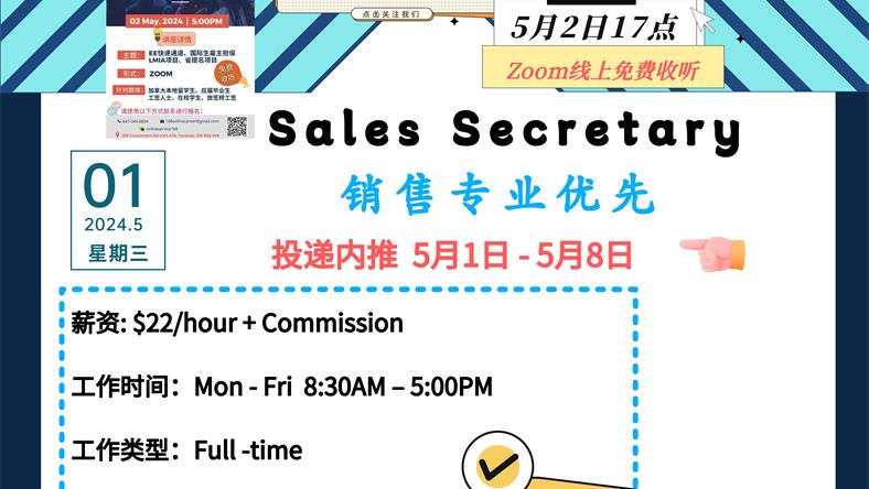 【168新岗】多伦多家居电器公司请Sales Secretary 1名(可移民)