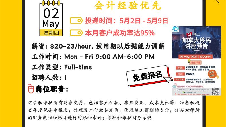 【168新岗】万锦律师事务所招聘Accountant 1名(可移民)