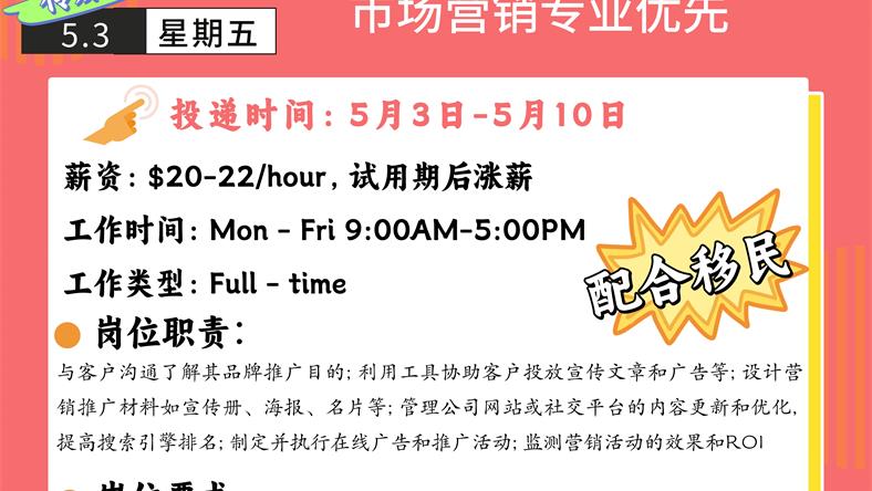 【168新岗】列治文山传媒公司招聘Marketing specialist 1名(可移民)