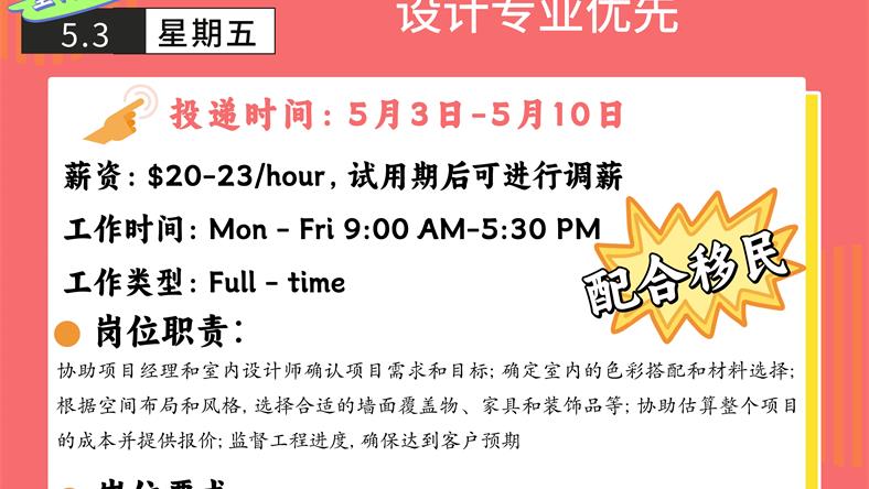 【168新岗】北约克室内设计公司请Interior Decorator 1名(可移民)