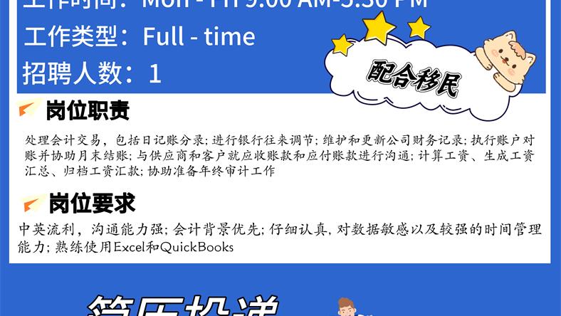 【168新岗】士嘉堡贸易公司招聘Bookkeeper 1名(可移民)