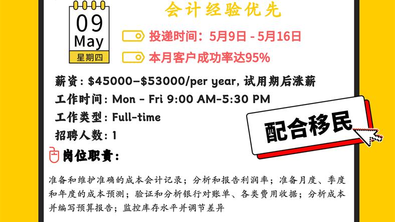 【168新岗】万锦服装贸易公司招聘Cost Accountant 1名(可移民)