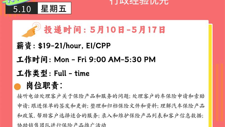 【168新岗】多伦多汽车保险公司招聘Office clerk 1名