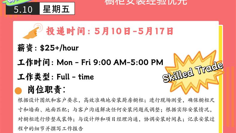【168新岗】士嘉堡橱柜制造公司请Kitchen Cabinet Installer 1名 (skilled trade+移民)