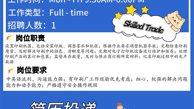 【168新岗】万锦印刷设计公司请Printing Press Operator 1名 (可移民)