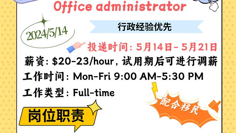 【168新岗】密西五金配件公司招聘Office administrator 1名 (可移民)