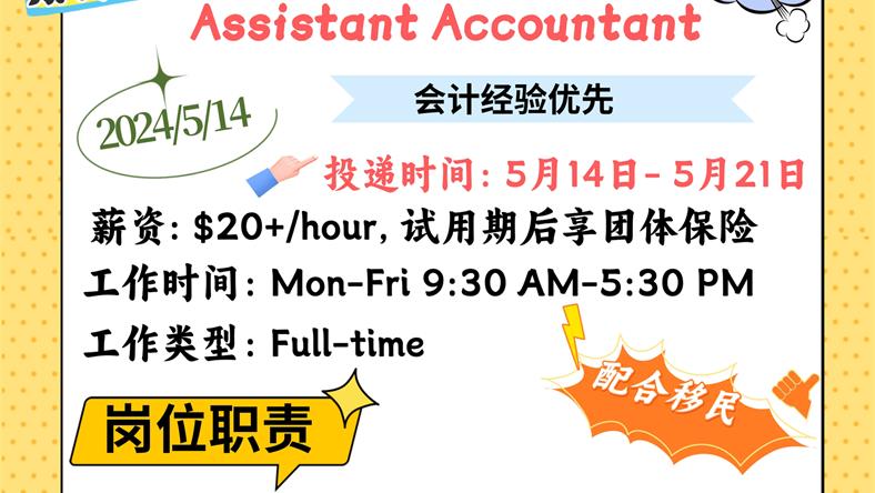 【168新岗】多伦多服装贸易公司招聘Assistant Accountant 1名(可移民)
