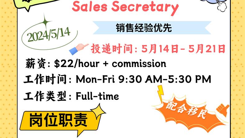 【168新岗】北约克教育机构请Sales Secretary 1名(可移民)