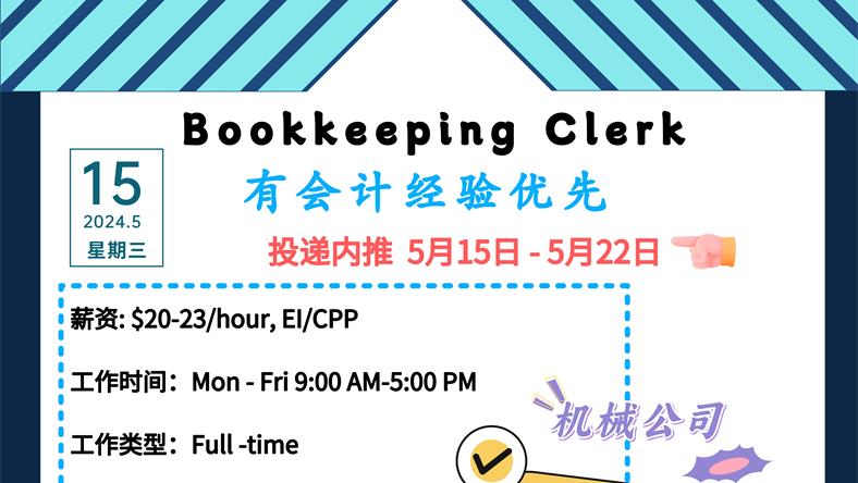 【168新岗】士嘉堡机械公司招聘Bookkeeping Clerk 1名(可移民)