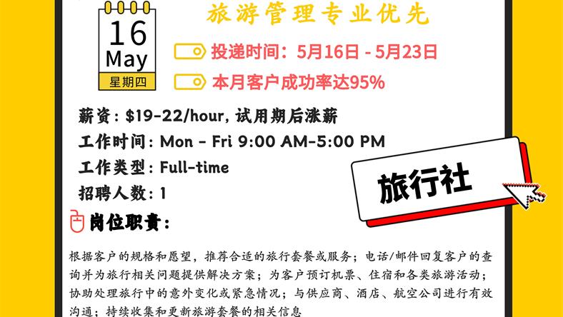 【168新岗】列治文山旅行社招聘Travel consultant 1名