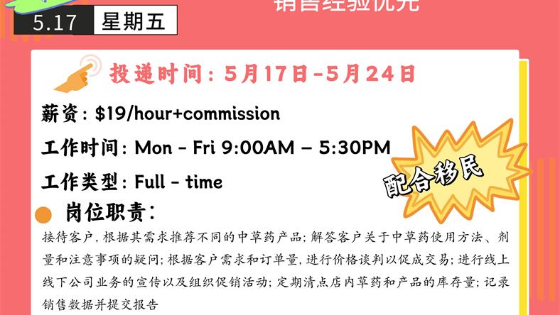 【168新岗】士嘉堡中草药店招Sales Secretary 1名 (可移民)
