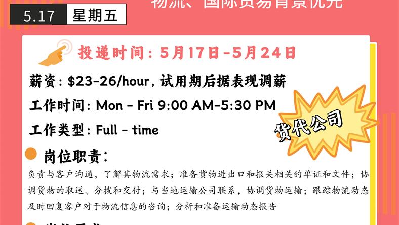 【168新岗】列治文山货代公司请Freight Forwarder Operator 1名