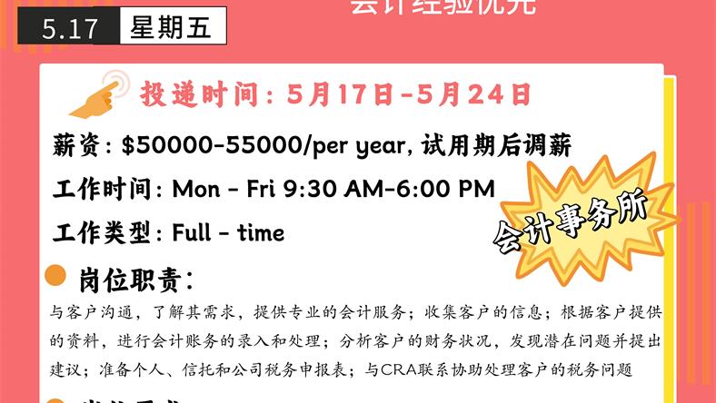 【168新岗】多伦多会计事务所招聘Junior Accountant 1名