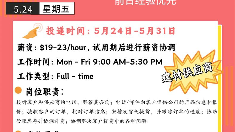 【168新岗】万锦建材供应商招聘Front desk clerk 1名
