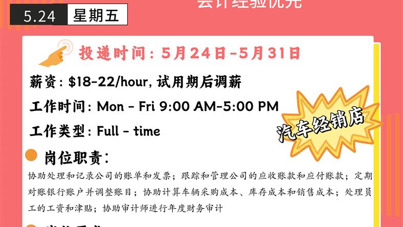 【168新岗】士嘉堡汽车经销店招聘Junior Accountant 1名