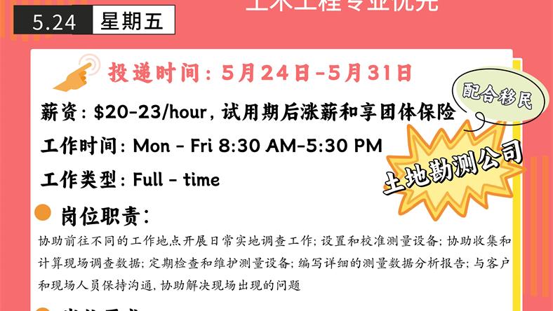 【168新岗】北约克土地勘测公司请Land Surveyor Assistant 1名(可移民)