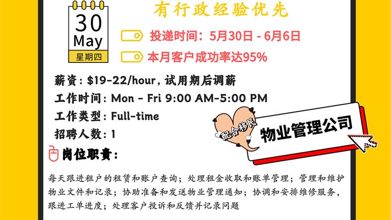 【168新岗】列治文山物业管理公司招聘Office administrator 1名 (可移民)