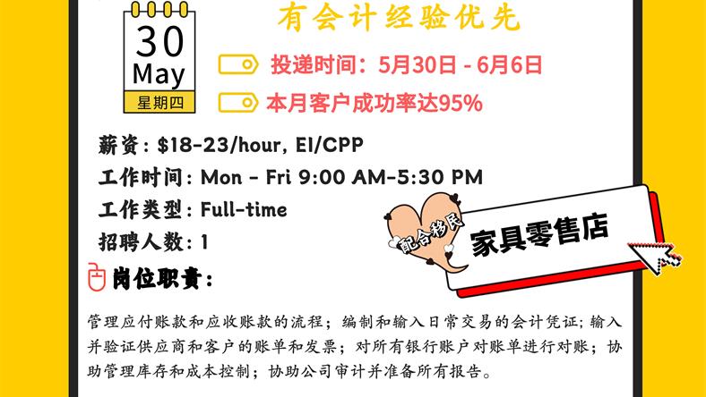 【168新岗】密西家具零售店招聘Assistant Accountant 1名(可移民)