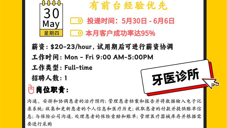 【168新岗】万锦牙医诊所招聘Dental Receptionist 1名