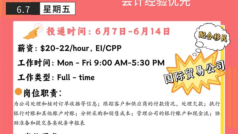 【168新岗】列治文山国际贸易公司招聘Accountant 1名(可移民)