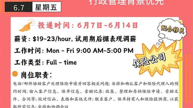 【168新岗】万锦保险公司招聘Administrative Assistant 1名 (可移民)